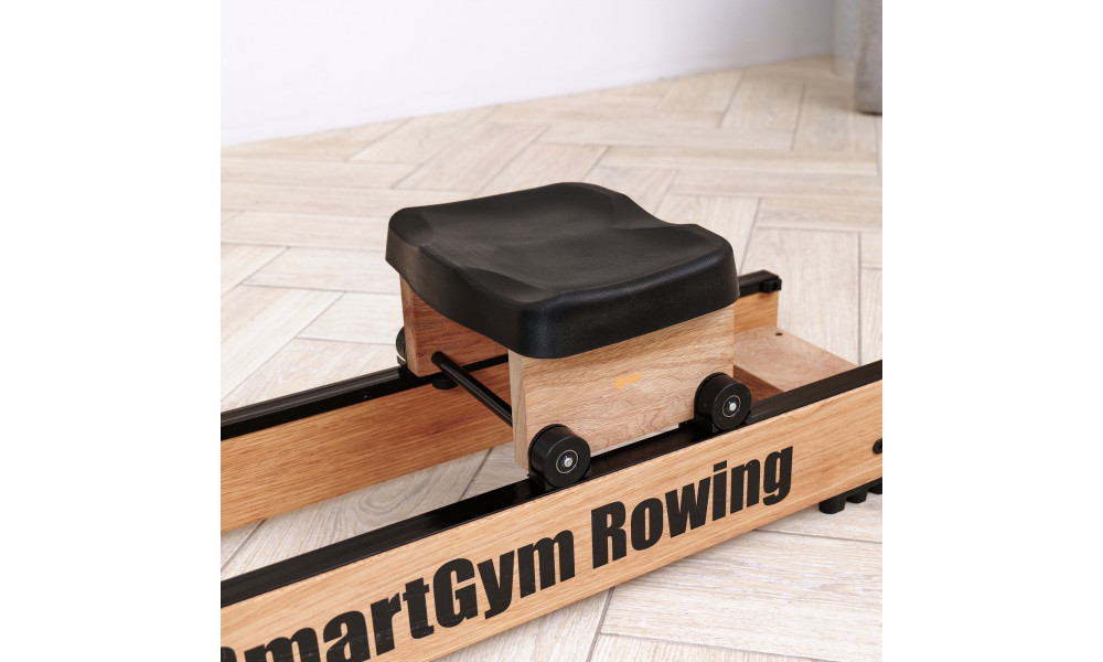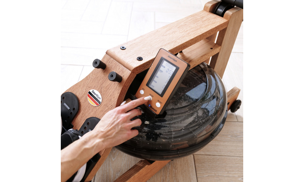 Консоль гребного тренажёра SmartGym имеет 8 уровней регулировки педалей и показывает время, расстояние, калории, пульс и обороты в минуту. Система нагрузки является водной: чем больше вы зальёте в бак воды, тем больше будет нагрузка. Транспортировочные ролики позволяют легко перемещать тренажёр, а его размер в сложенном виде составляет 60 x 56,5 x 210 см.