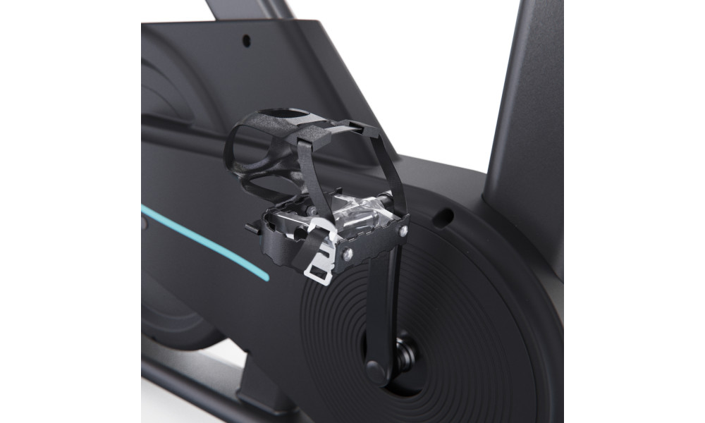 Маховик массой 15 килограмм обеспечивает плавный ход и регулировку интенсивности нагрузки. Возможность крутить педали в обе стороны добавляет разнообразия в тренировочный процесс. Ремень, обернутый вокруг маховика, обеспечивает уровень шума не более 52 дБ, делая спин-байк идеальным вариантом для домашнего использования.